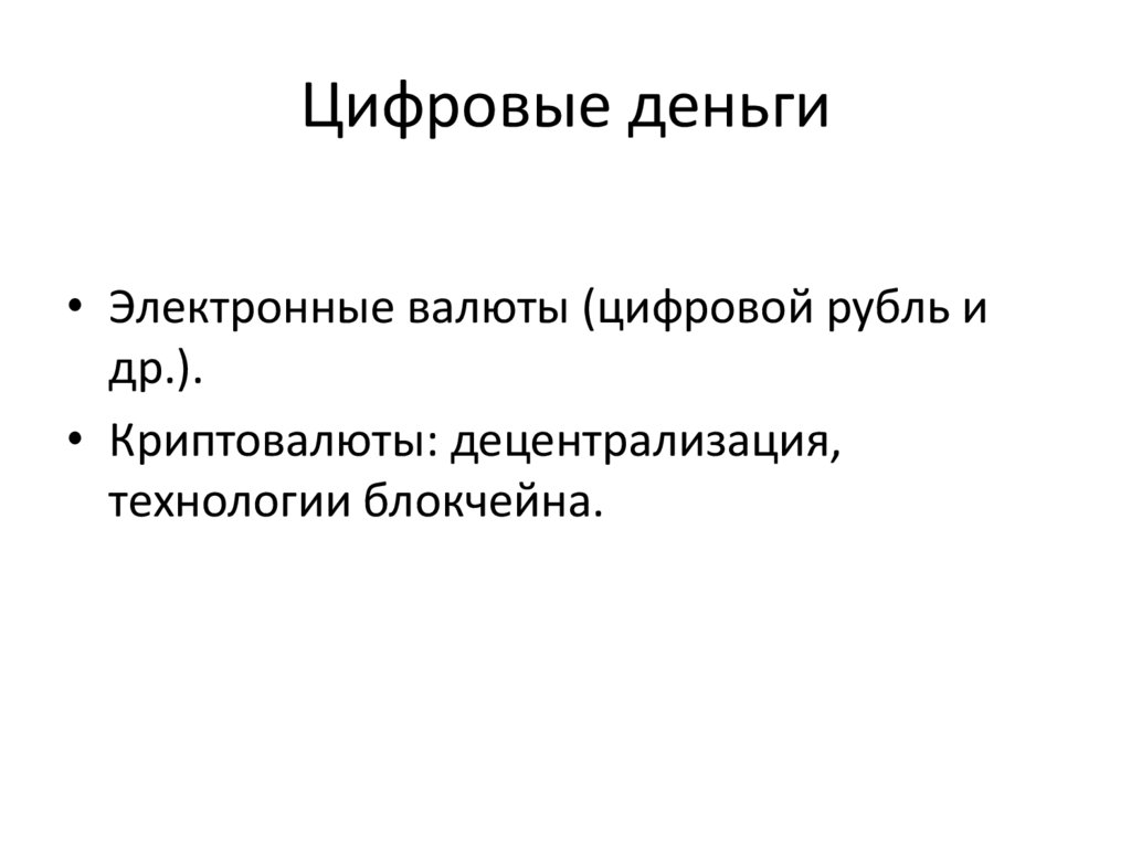 Цифровые деньги• Электронные валюты (цифровой рубль и