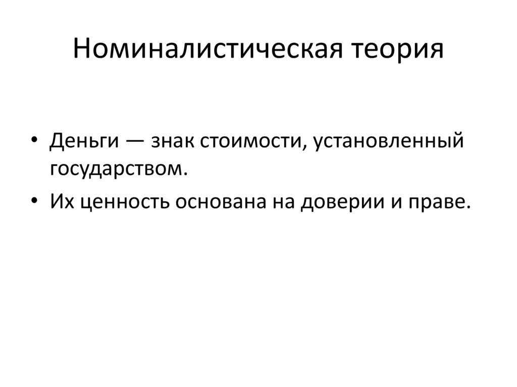 Номиналистическая теория• Деньги — знак стоимости, установленный