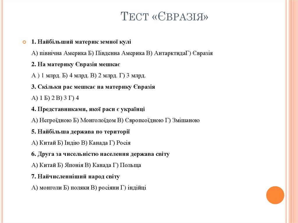 ТЕСТ «ЄВРАЗІЯ»1. Найбільший материк земної кулі