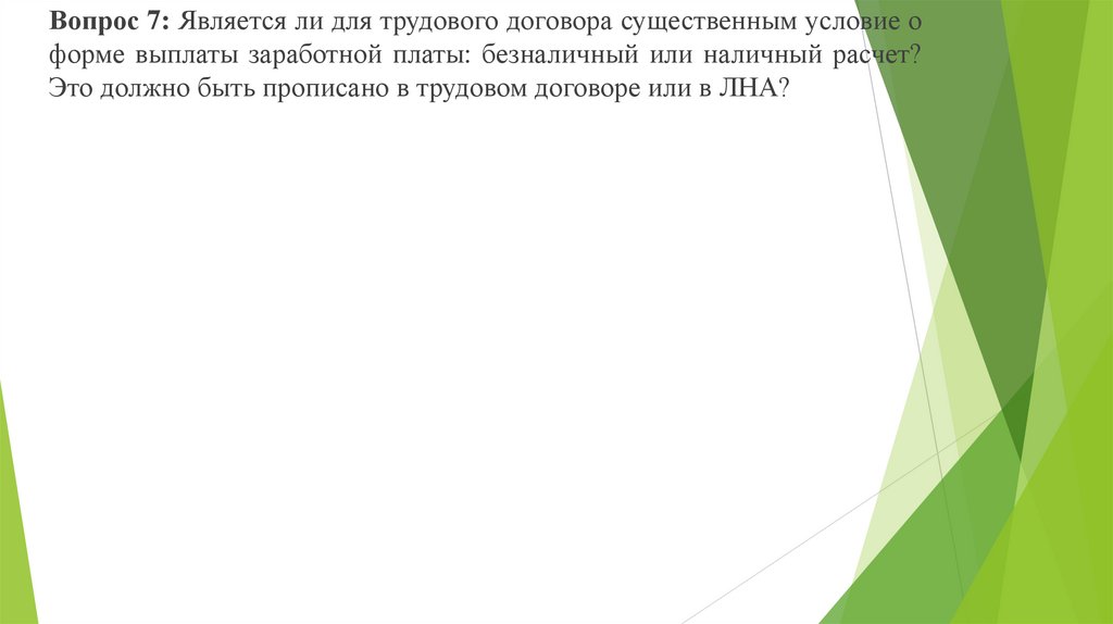 Вопрос 7: Является ли для трудового договора существенным условие оформе выплаты заработной платы: безналичный или наличный расчет?