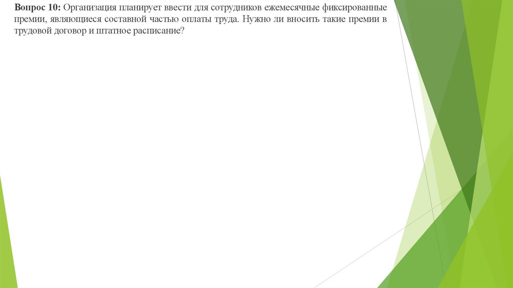 Вопрос 10: Организация планирует ввести для сотрудников ежемесячные фиксированныепремии, являющиеся составной частью оплаты труда. Нужно ли вносить такие премии в