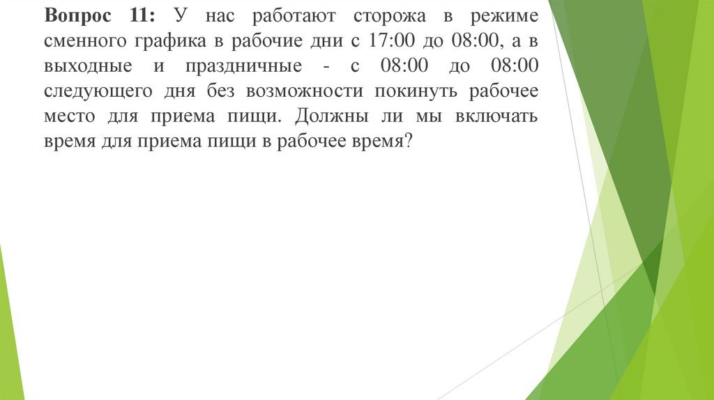 Вопрос 11: У нас работают сторожа в режимесменного графика в рабочие дни с 17:00 до 08:00, а в