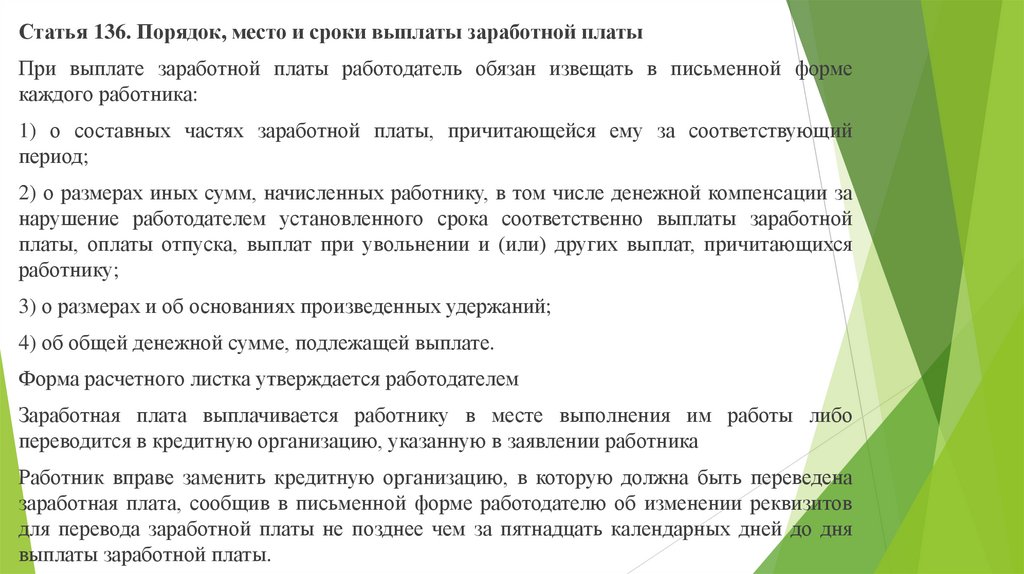 Статья 136. Порядок, место и сроки выплаты заработной платыПри выплате заработной платы работодатель обязан извещать в письменной форме