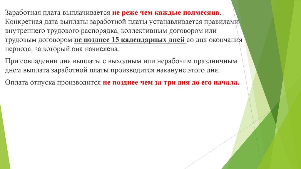 Заработная плата выплачивается не реже чем каждые полмесяца.Конкретная дата выплаты заработной платы устанавливается правилами