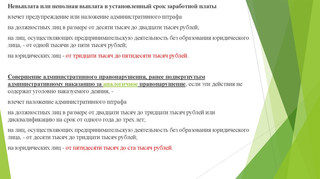 Невыплата или неполная выплата в установленный срок заработной платывлечет предупреждение или наложение административного штрафа