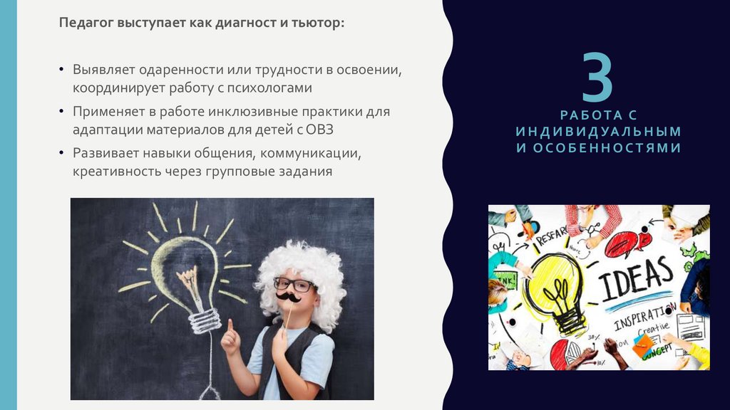 Педагог выступает как диагност и тьютор:• Выявляет одаренности или трудности в освоении,