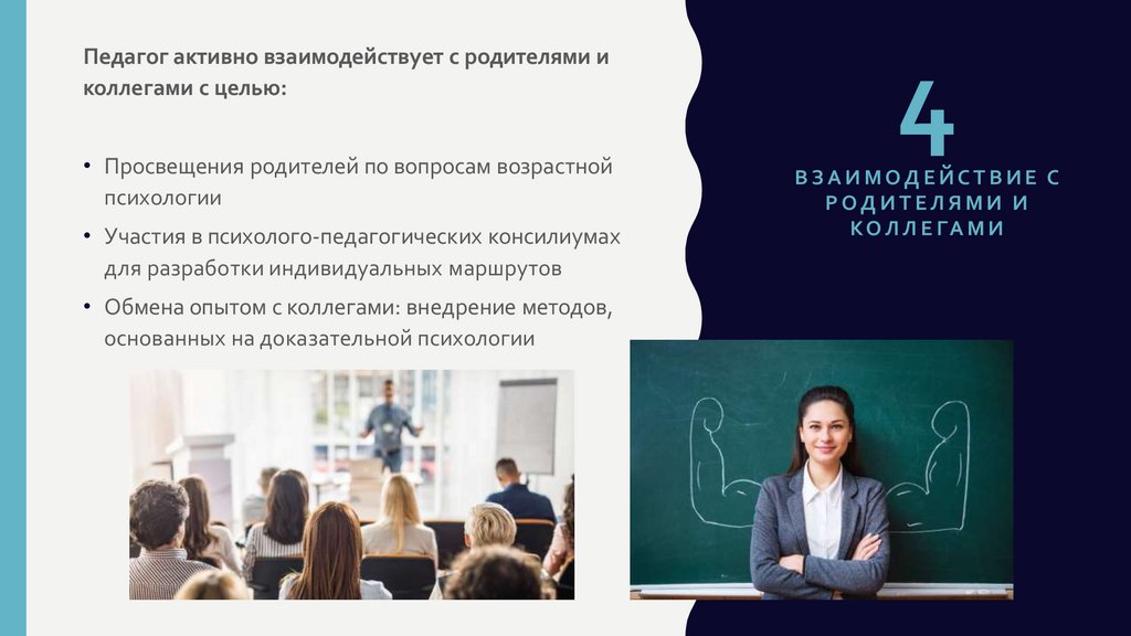 Педагог активно взаимодействует с родителями иколлегами с целью:
