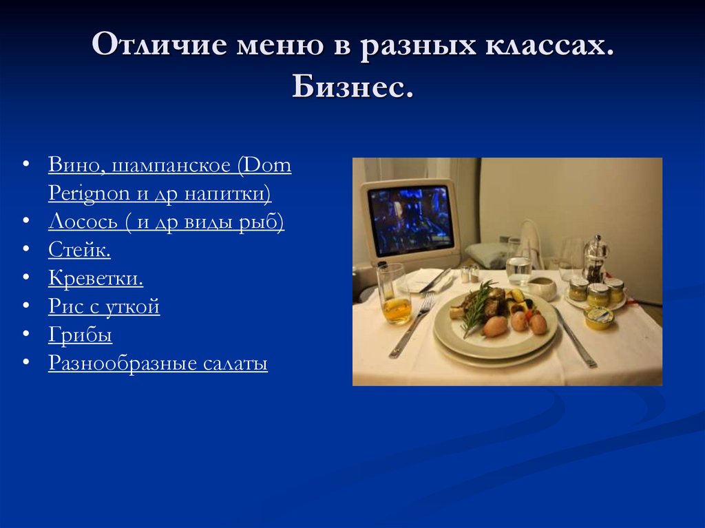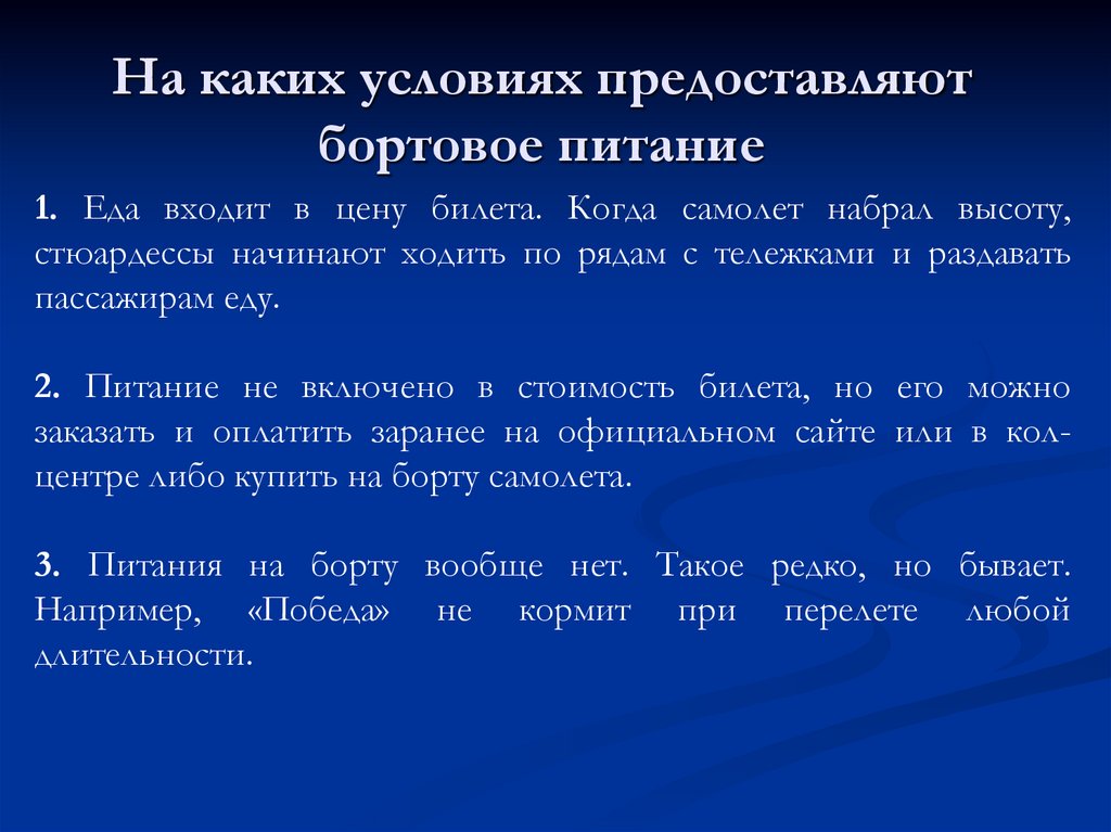 1. Еда входит в цену билета. Когда самолет набрал высоту,стюардессы начинают ходить по рядам с тележками и раздавать