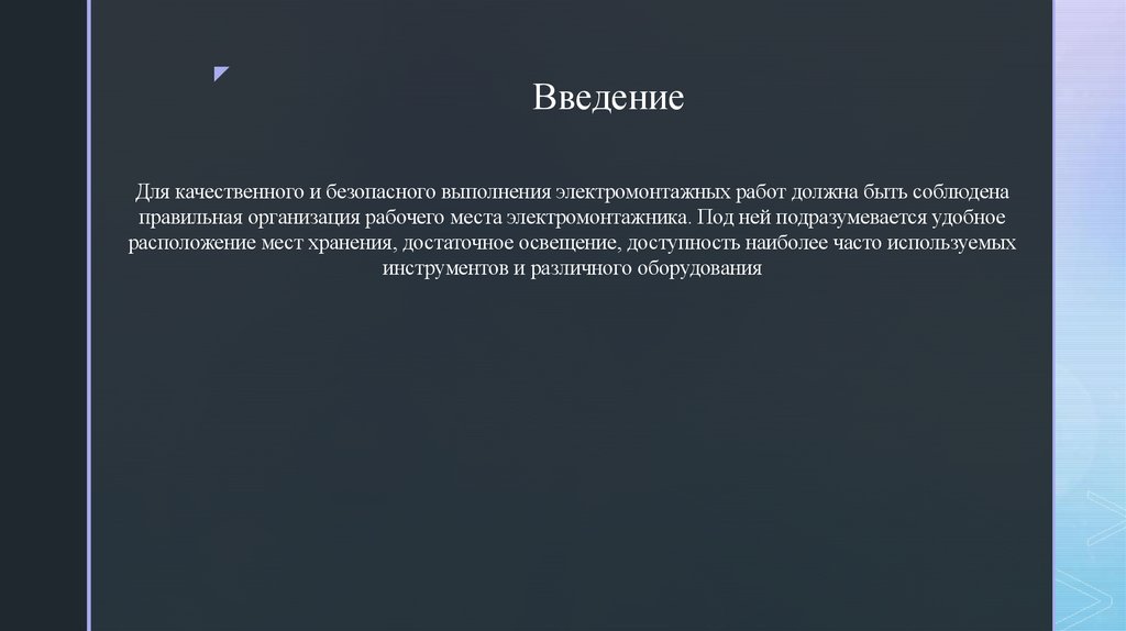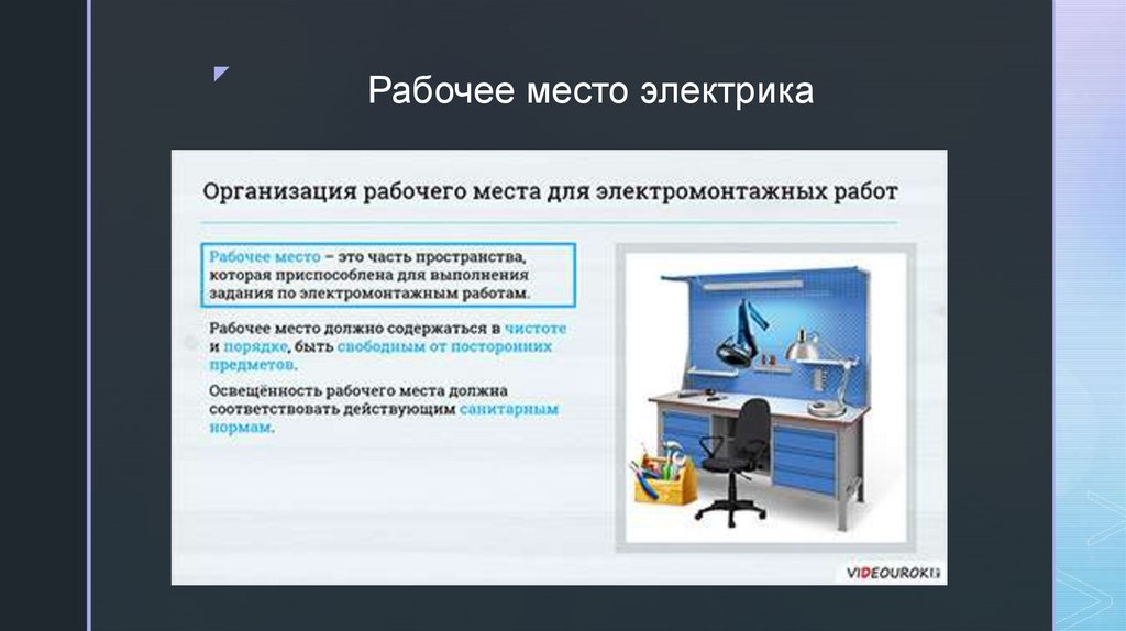 правильная организация рабочего места электромонтажника. Под ней подразумевается удобное