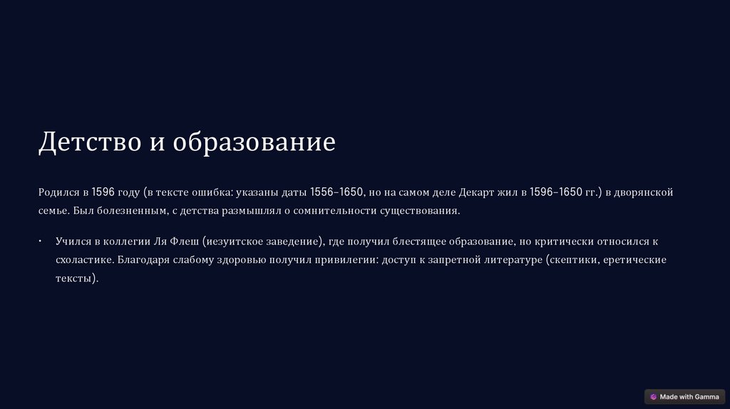 Детство и образованиеРодился в 1596 году (в тексте ошибка: указаны даты 1556–1650, но на самом деле Декарт жил в 1596–1650 гг.) в дворянской
