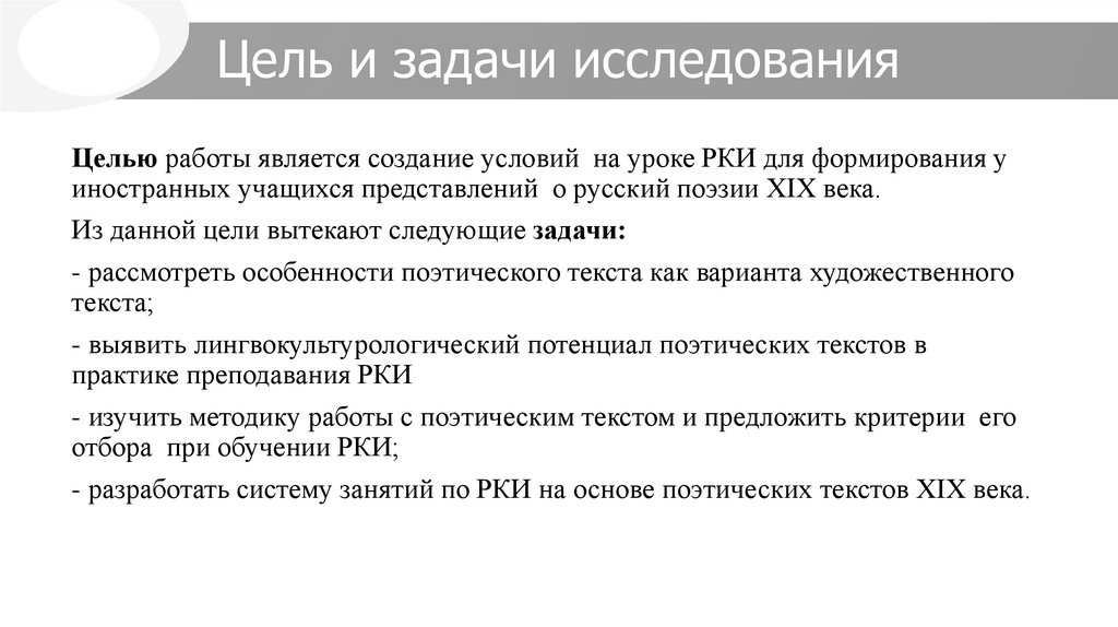 Целью работы является создание условий на уроке РКИ для формирования уиностранных учащихся представлений о русский поэзии XIX века.