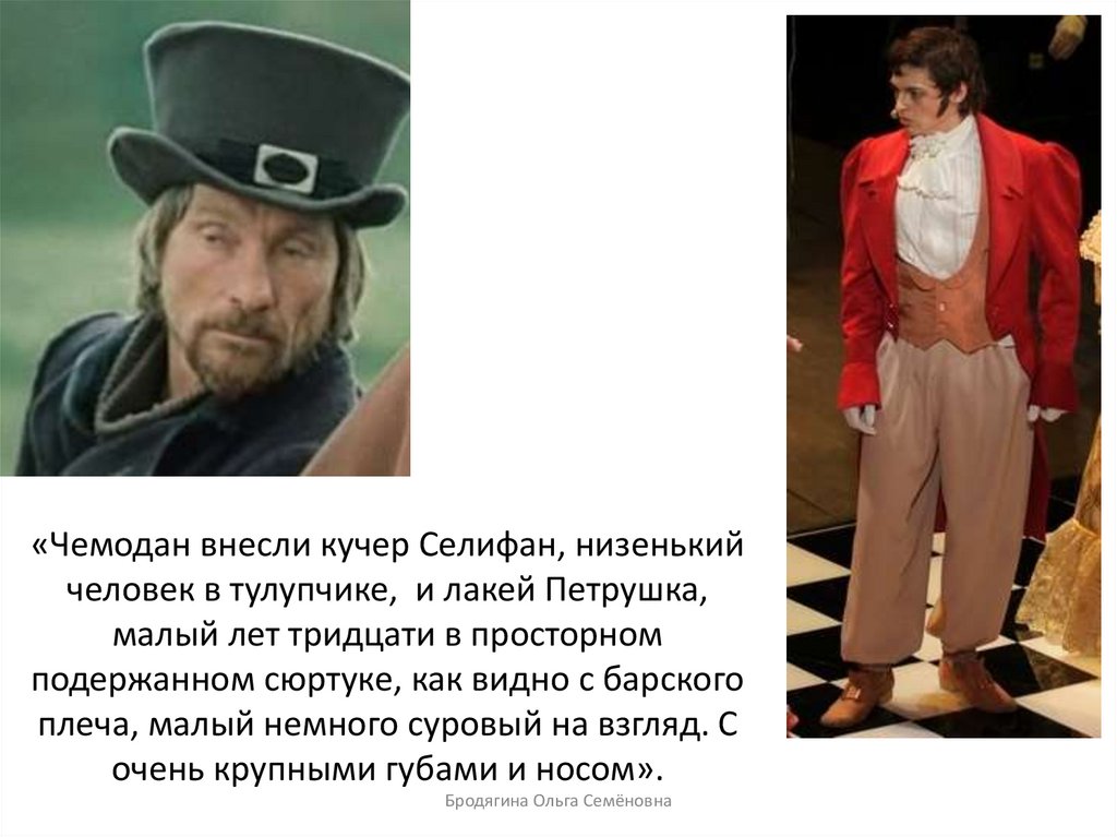 10. «Чемодан внесли кучер Селифан, низенький человек в тулупчике, и лакей Петрушка, малый лет тридцати в просторном подержанном
