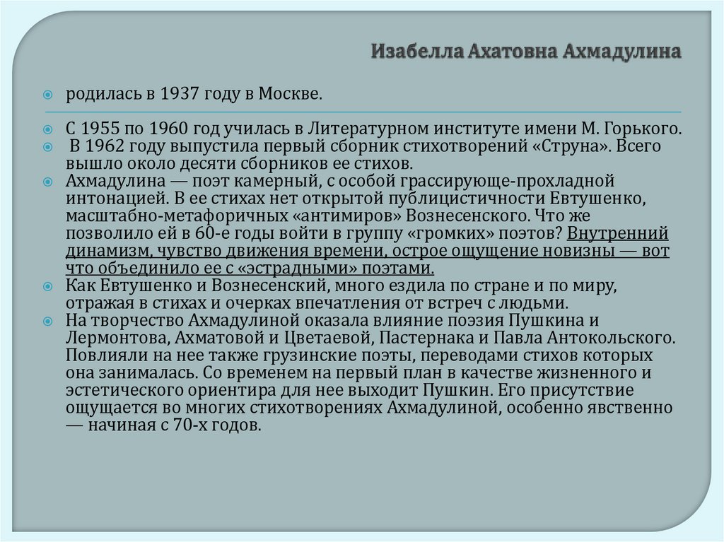 На творчество Ахмадулиной оказала влияние поэзия Пушкина и