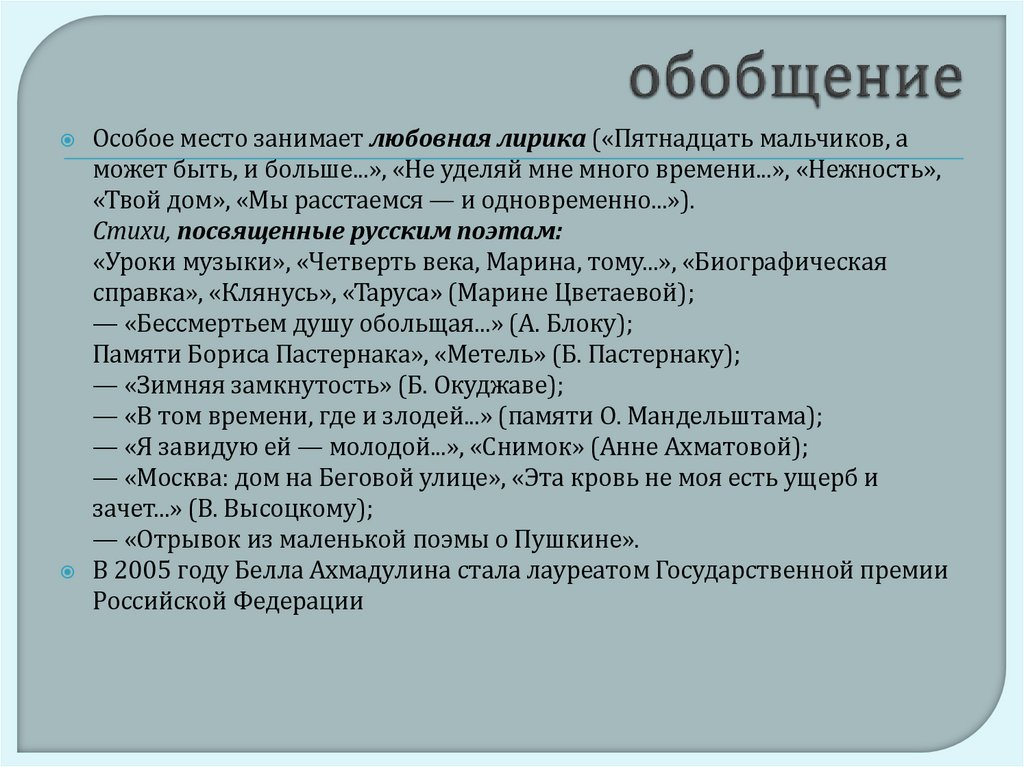 Особое место занимает любовная лирика («Пятнадцать мальчиков, аможет быть, и больше...», «Не уделяй мне много времени...», «Нежность»,