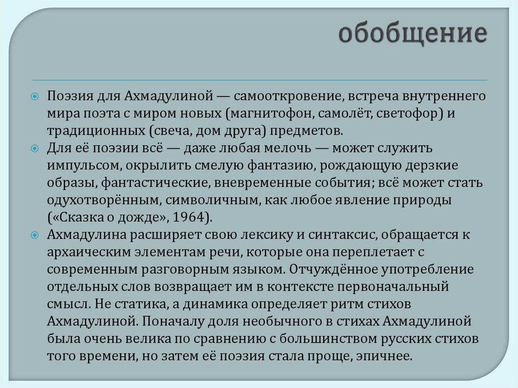 Ахмадулина расширяет свою лексику и синтаксис, обращается к
