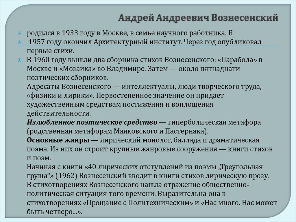 груша“» (1962) Вознесенский вводит в книги стихов лирическую прозу.