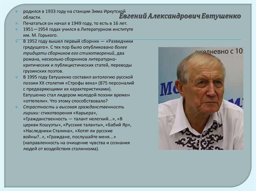 Евтушенко стал лидером молодой поэзии времен