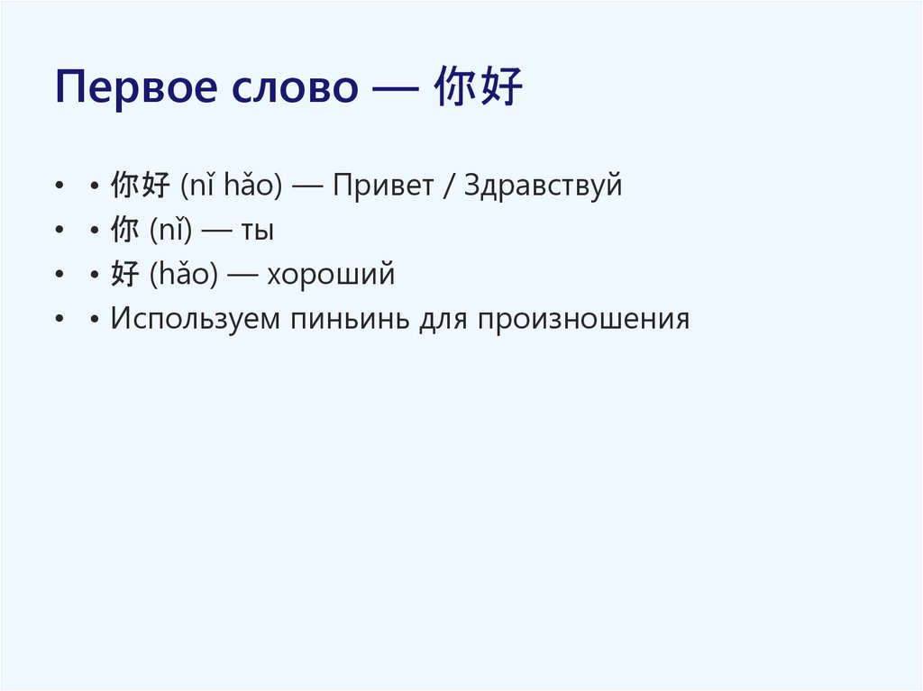 Первое слово — 你好• 你好 (nǐ hǎo) — Привет / Здравствуй