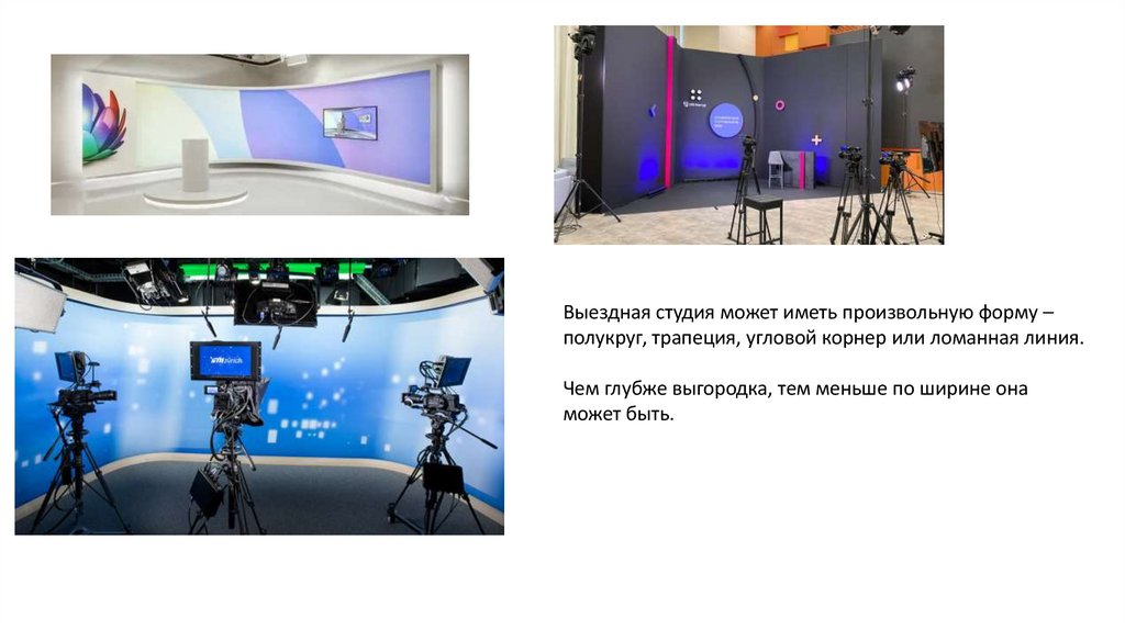 Выездная студия может иметь произвольную форму –полукруг, трапеция, угловой корнер или ломанная линия.