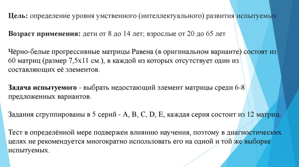 Цель: определение уровня умственного (интеллектуального) развития испытуемыхВозраст применения: дети от 8 до 14 лет; взрослые от 20 до 65 лет