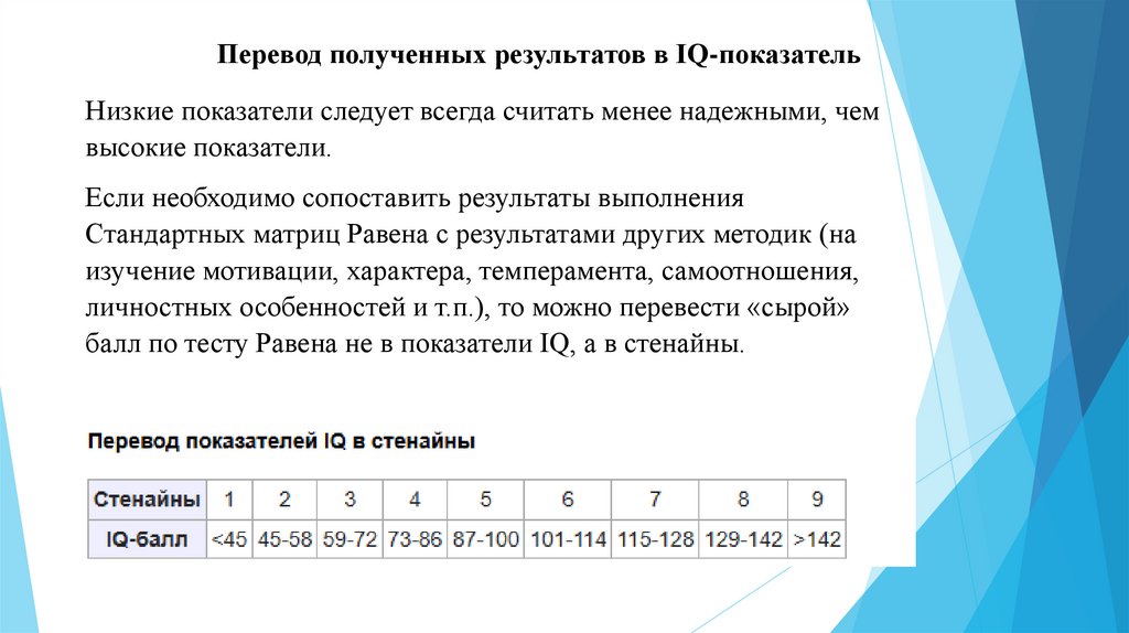Перевод полученных результатов в IQ-показательНизкие показатели следует всегда считать менее надежными, чем