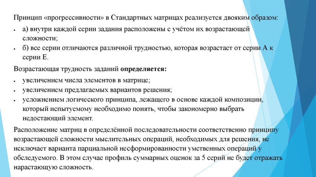 Принцип «прогрессивности» в Стандартных матрицах реализуется двояким образом:а) внутри каждой серии задания расположены с учётом их возрастающей