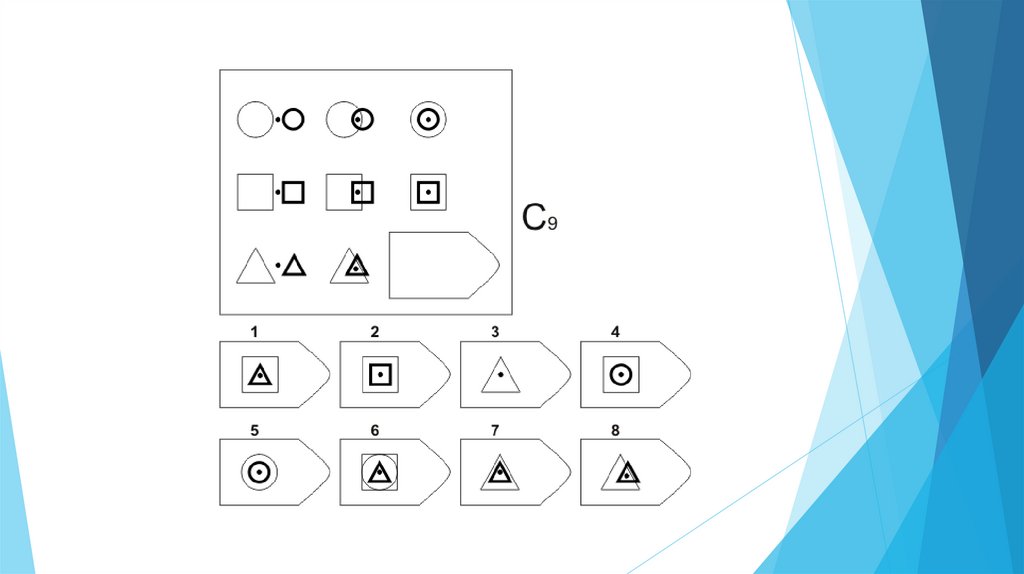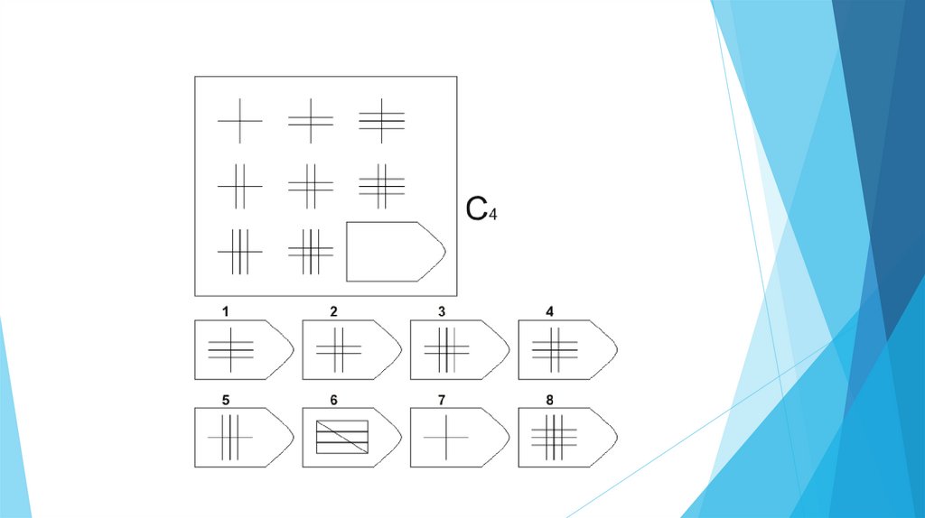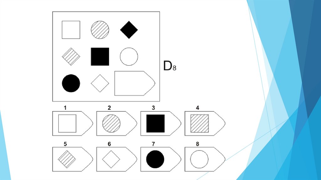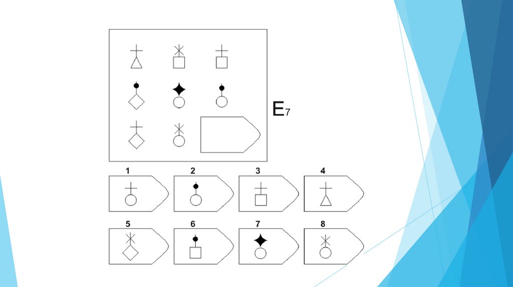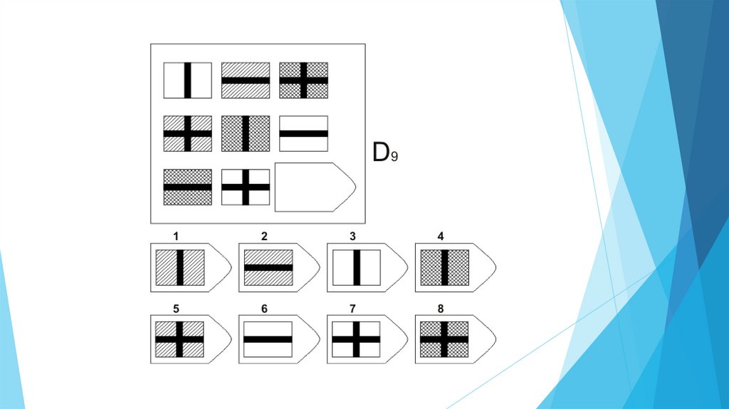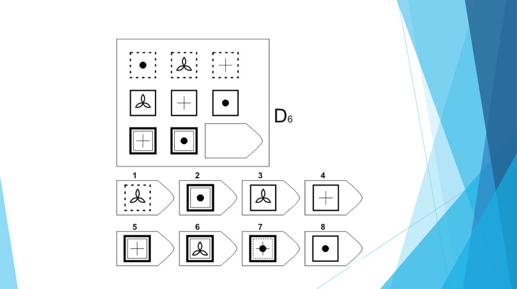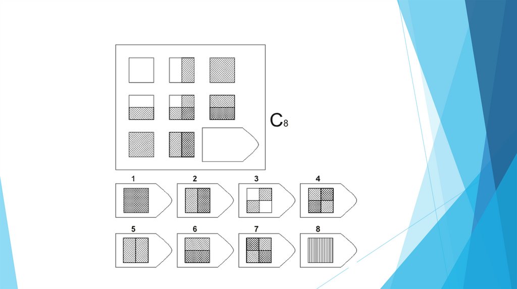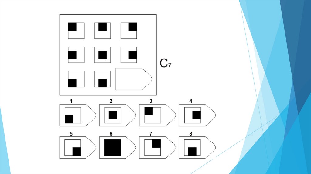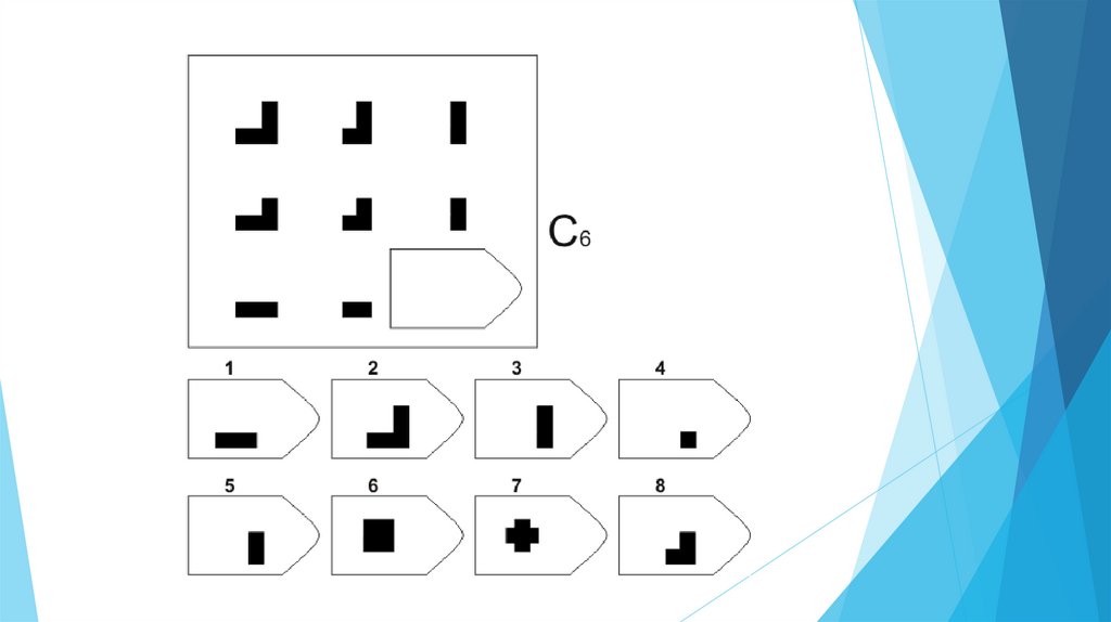 Задача испытуемого - выбрать недостающий элемент матрицы среди 6-8