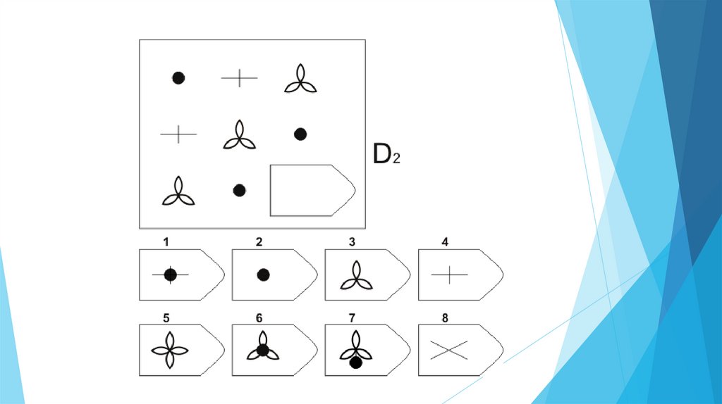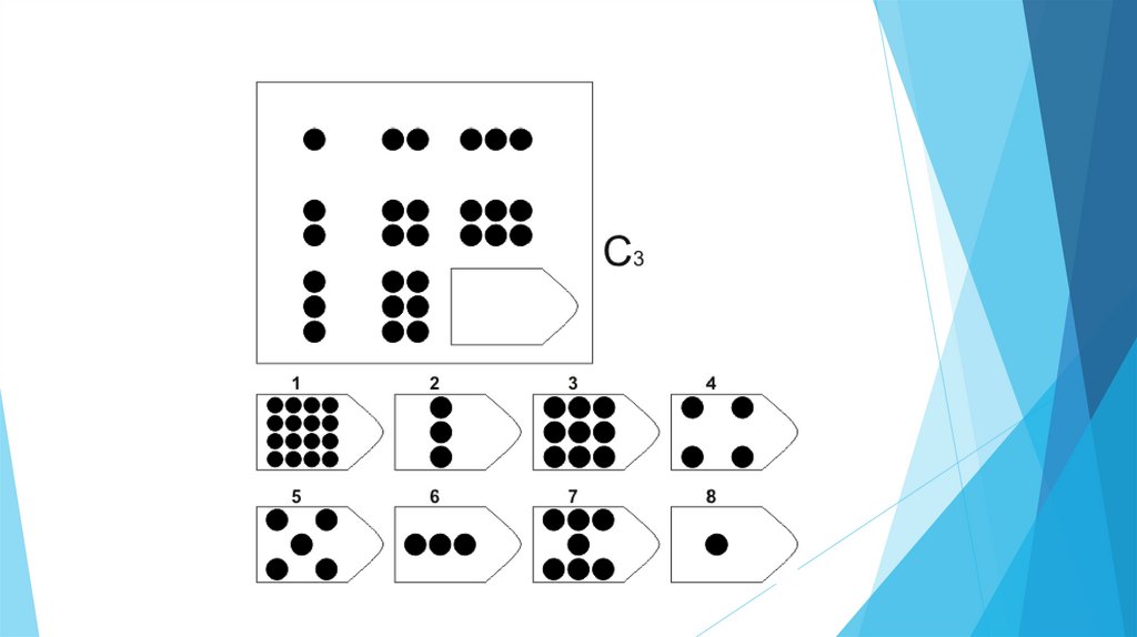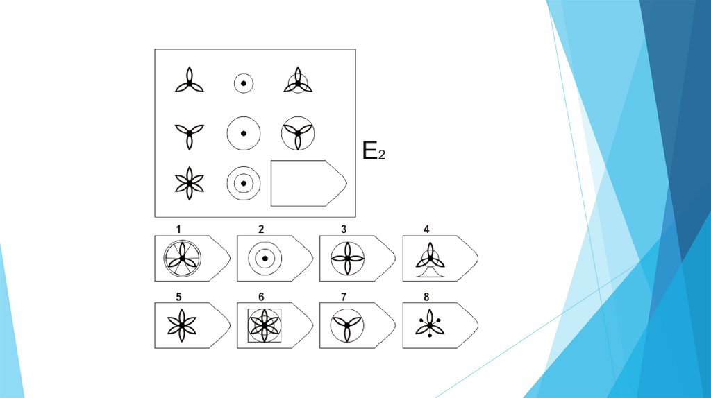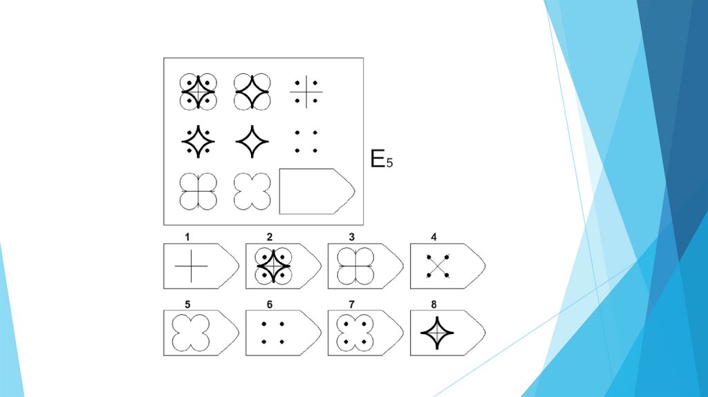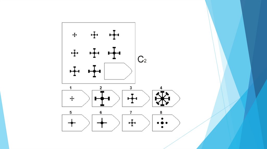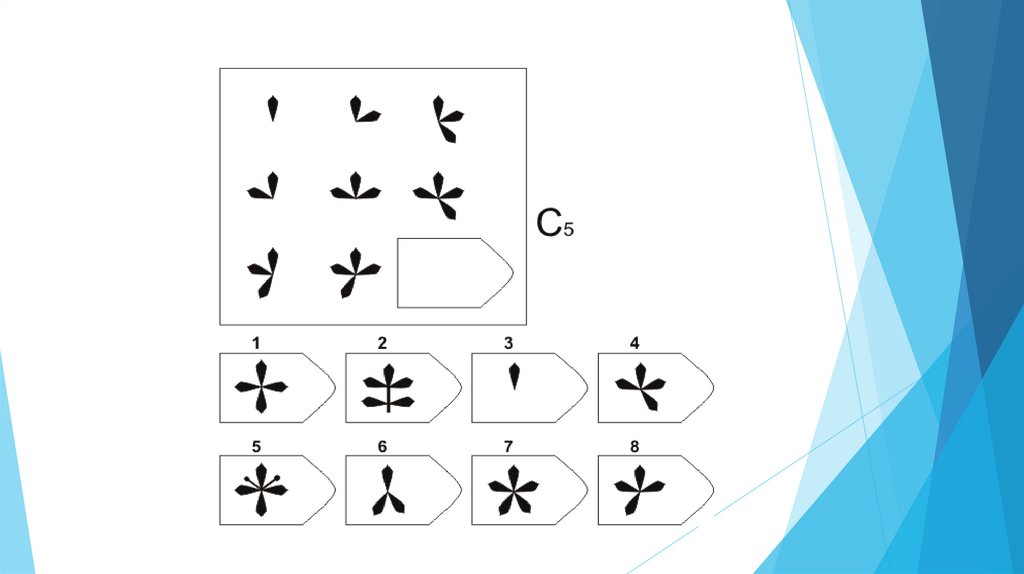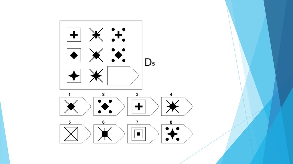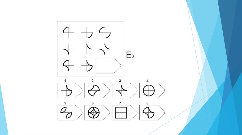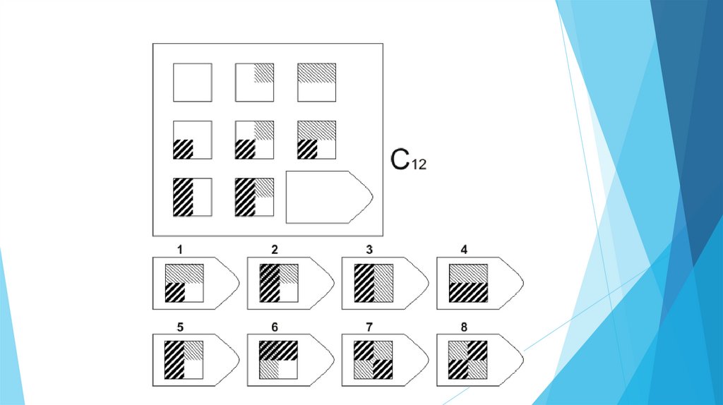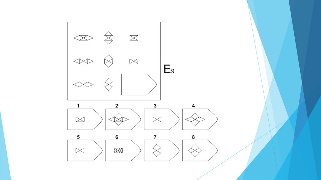 Задача испытуемого - выбрать недостающий элемент матрицы среди 6-8