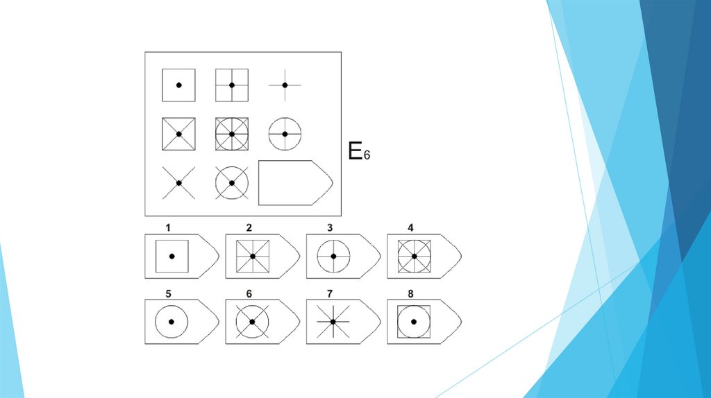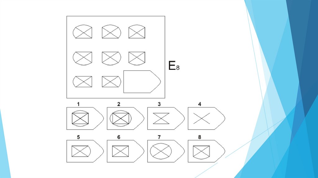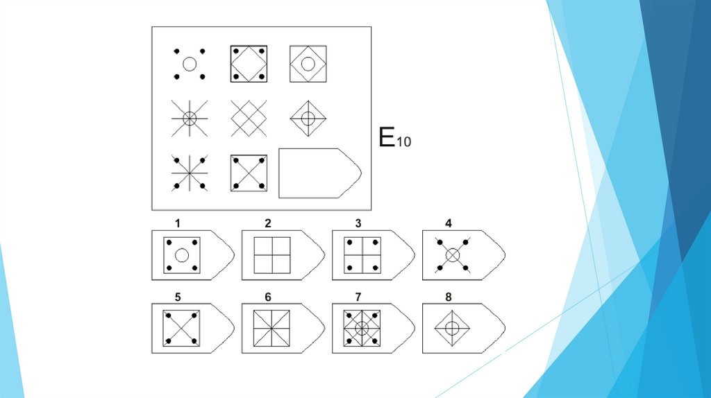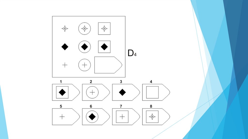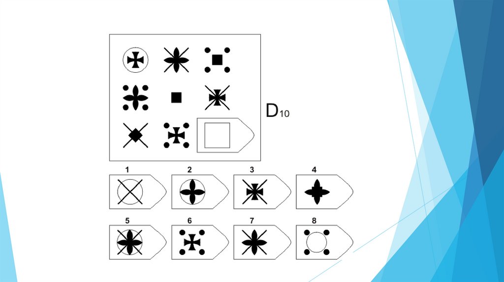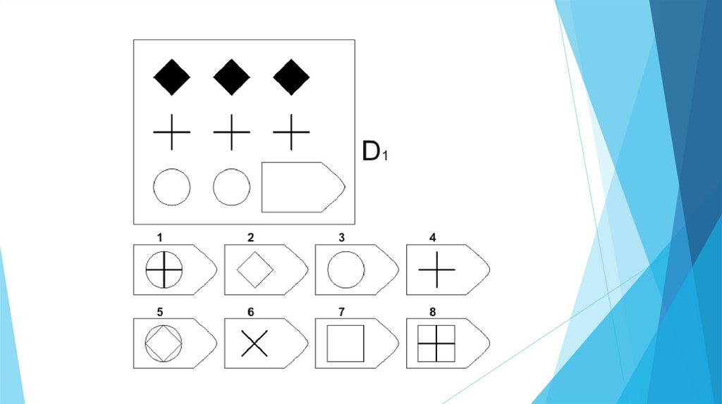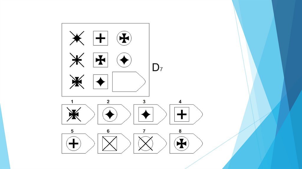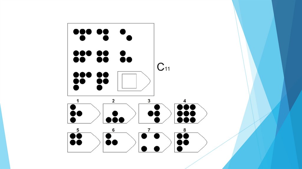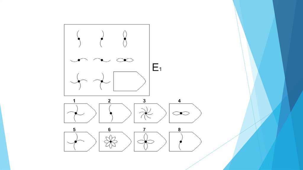 Задача испытуемого - выбрать недостающий элемент матрицы среди 6-8