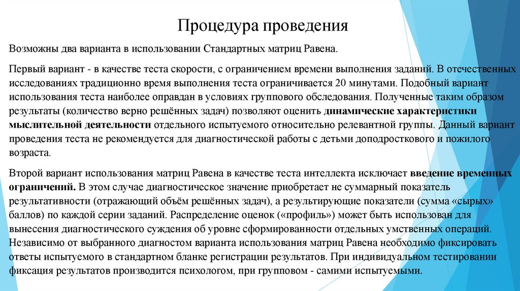 Процедура проведенияВозможны два варианта в использовании Стандартных матриц Равена.