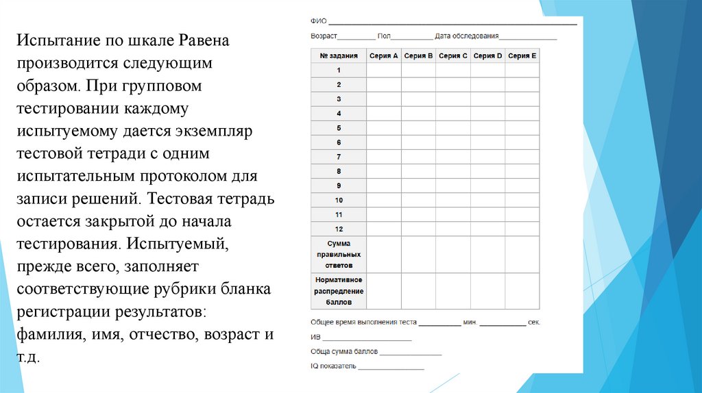Испытание по шкале Равенапроизводится следующим