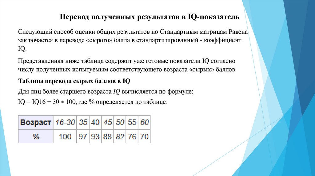 IQ = IQ16 − 30 ∗ 100, где % определяется по таблице: