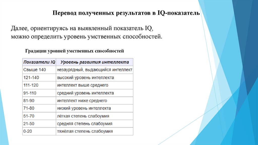 Перевод полученных результатов в IQ-показательДалее, ориентируясь на выявленный показатель IQ,
