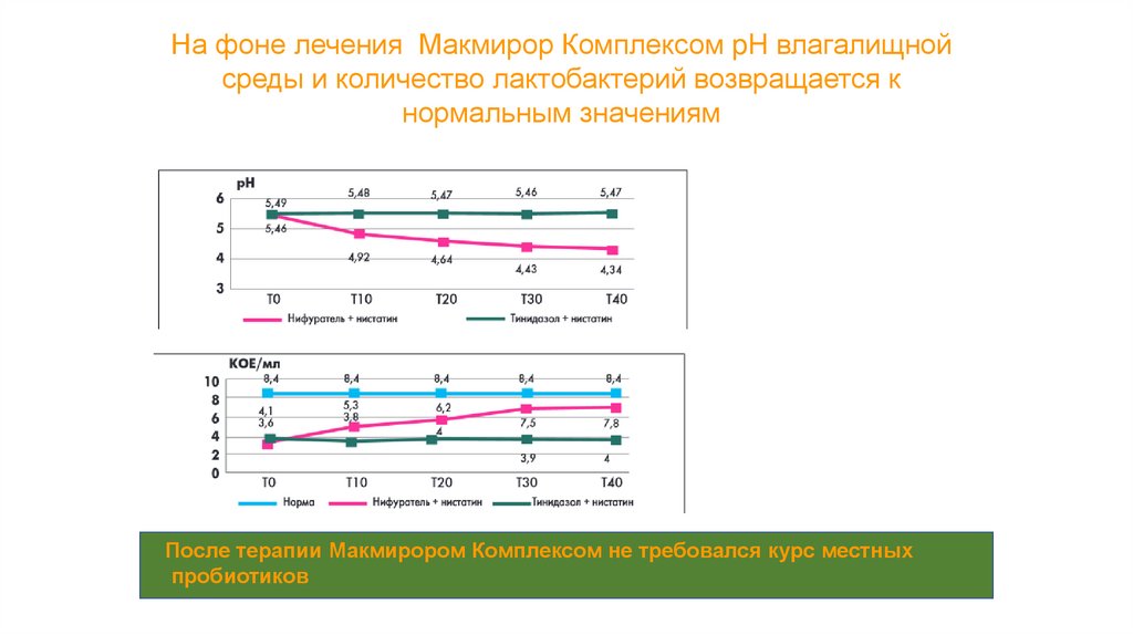 На фоне лечения Макмирор Комплексом pH влагалищнойсреды и количество лактобактерий возвращается к