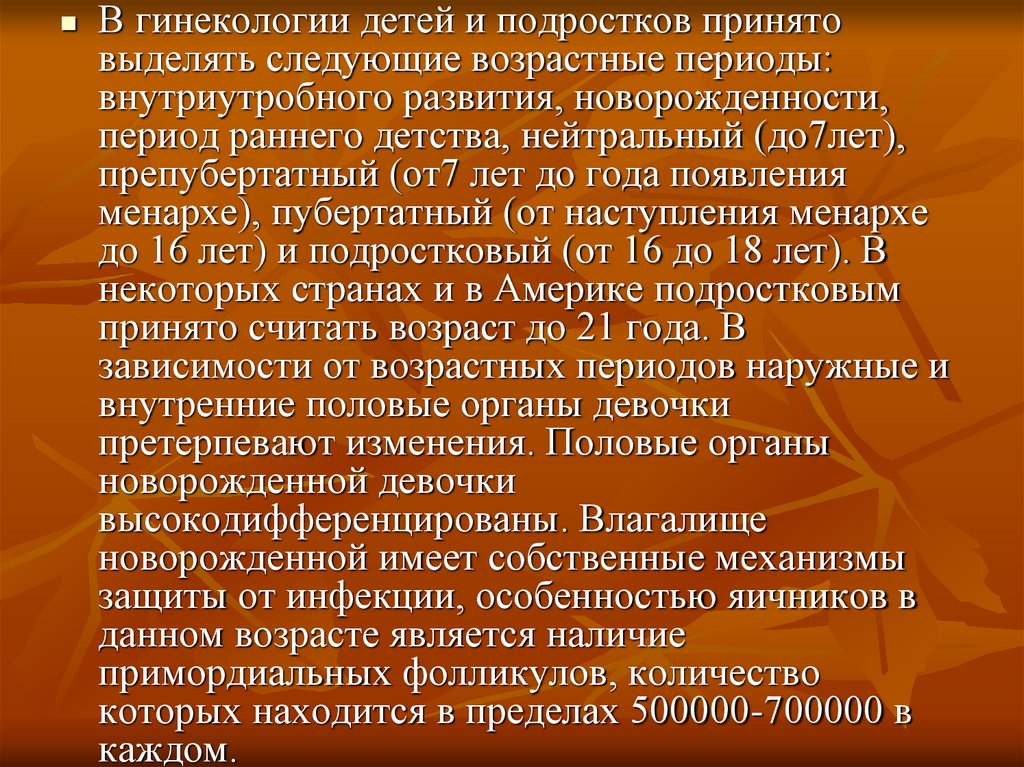 В гинекологии детей и подростков принятовыделять следующие возрастные периоды: