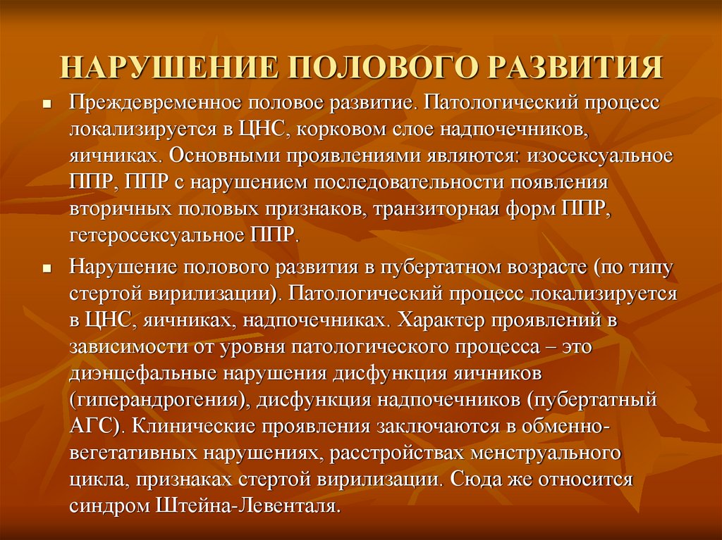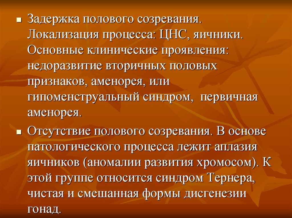 Задержка полового созревания.Локализация процесса: ЦНС, яичники.