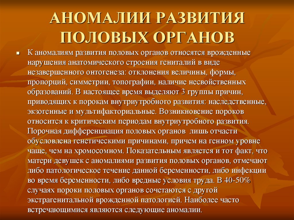 К аномалиям развития половых органов относятся врожденныенарушения анатомического строения гениталий в виде