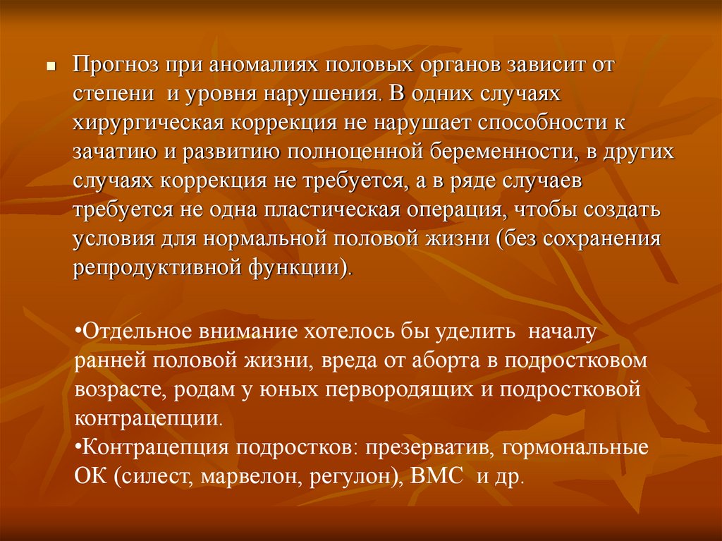 Прогноз при аномалиях половых органов зависит отстепени и уровня нарушения. В одних случаях