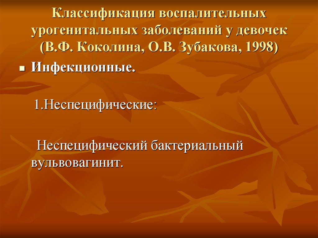 10. Классификация воспалительных урогенитальных заболеваний у девочек (В.Ф. Коколина, О.В. Зубакова, 1998)