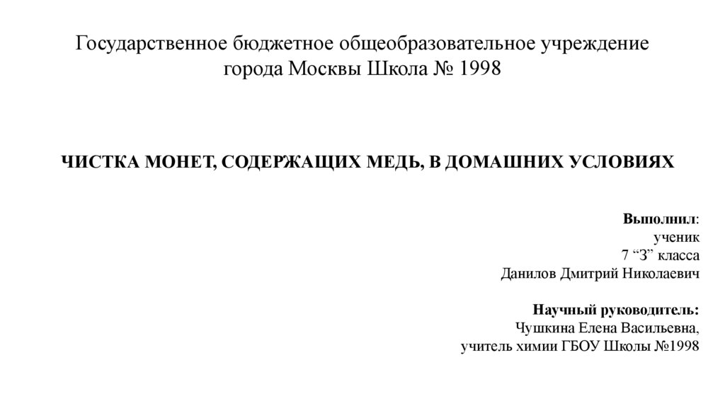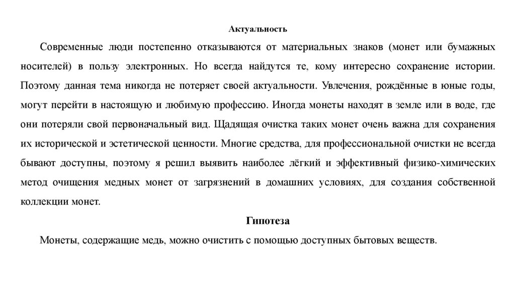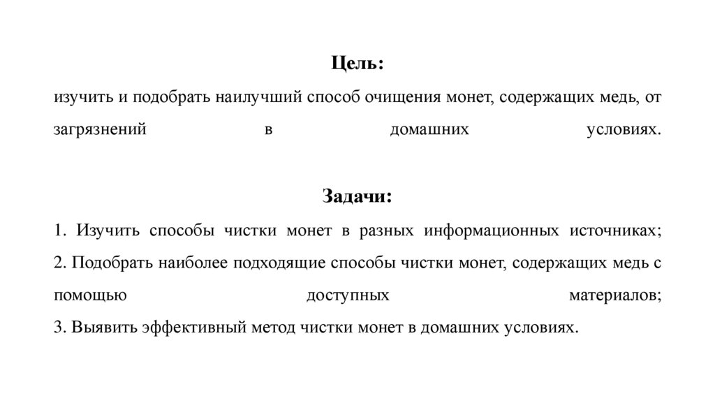 Цель:изучить и подобрать наилучший способ очищения монет, содержащих медь, от