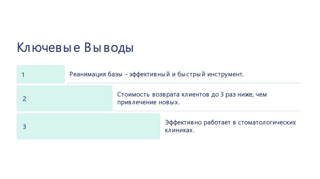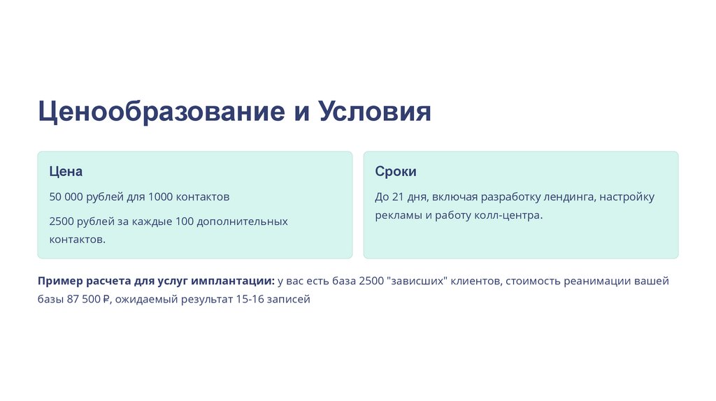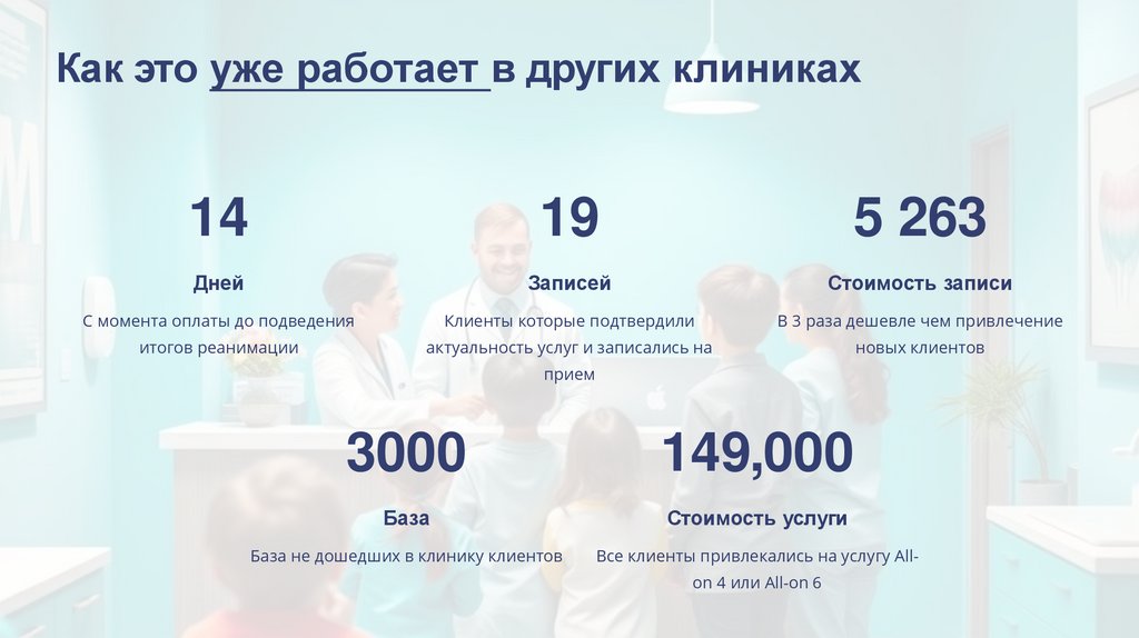 Пример расчета для услуг имплантации: у вас есть база 2500 "зависших" клиентов, стоимость реанимации вашей