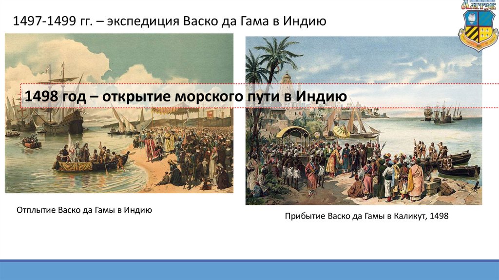 1497-1499 гг. – экспедиция Васко да Гама в Индию1498 год – открытие морского пути в Индию