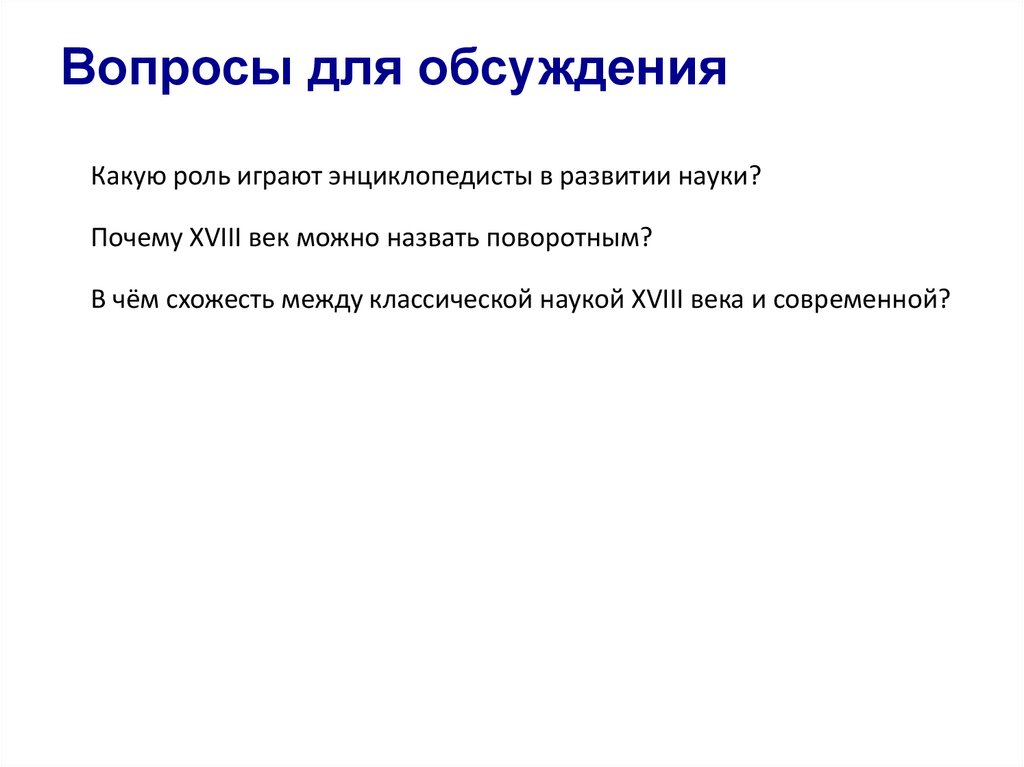 Вопросы для обсужденияКакую роль играют энциклопедисты в развитии науки?