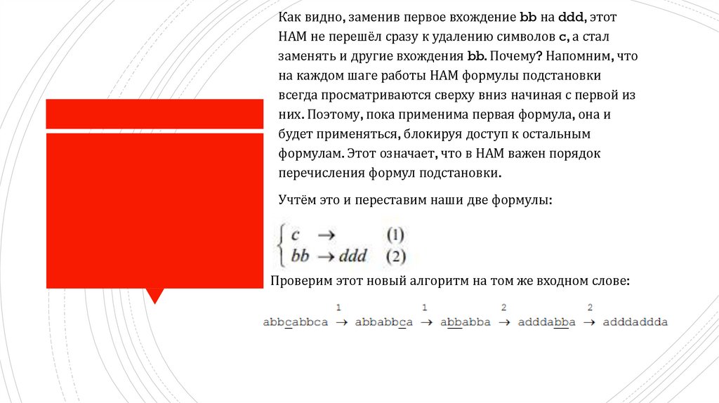 Как видно, заменив первое вхождение bb на ddd, этотНАМ не перешёл сразу к удалению символов c, а стал