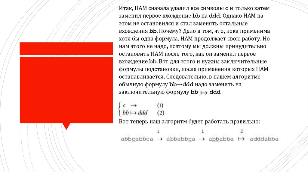 Итак, НАМ сначала удалил все символы c и только затемзаменил первое вхождение bb на ddd. Однако НАМ на