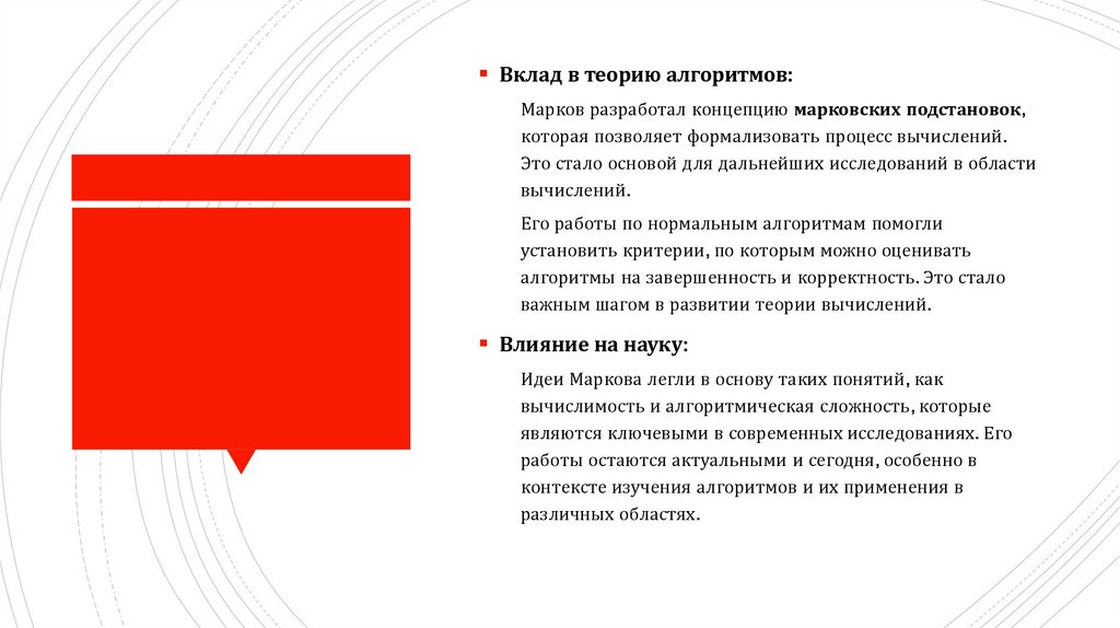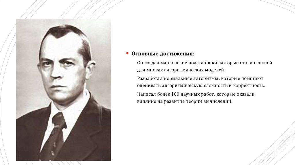 Вклад в теорию алгоритмов:Марков разработал концепцию марковских подстановок,