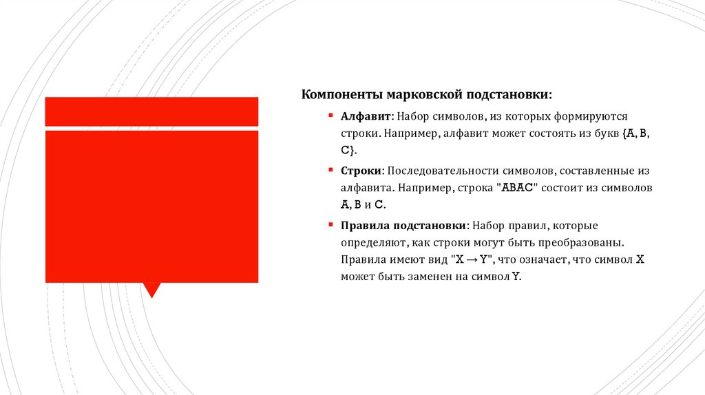 Компоненты марковской подстановки:Алфавит: Набор символов, из которых формируются