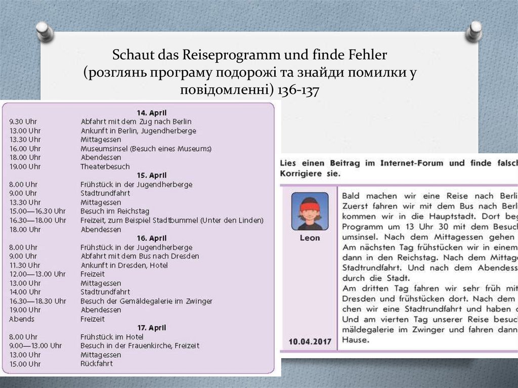 5. Schaut das Reiseprogramm und finde Fehler (розглянь програму подорожі та знайди помилки у повідомленні) 136-137
