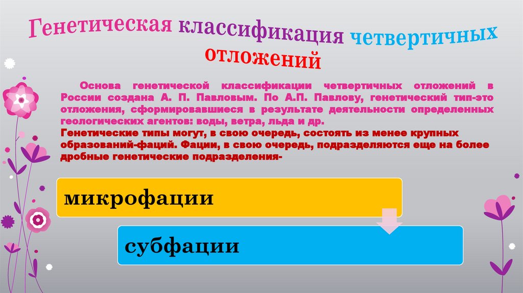 Основа генетической классификации четвертичных отложений вРоссии создана А. П. Павловым. По А.П. Павлову, генетический тип-это