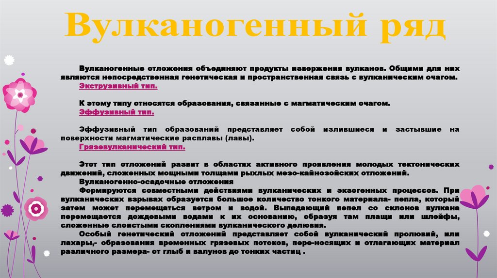 Вулканогенные отложения объединяют продукты извержения вулканов. Общими для нихявляются непосредственная генетическая и пространственная связь с вулканическим очагом.